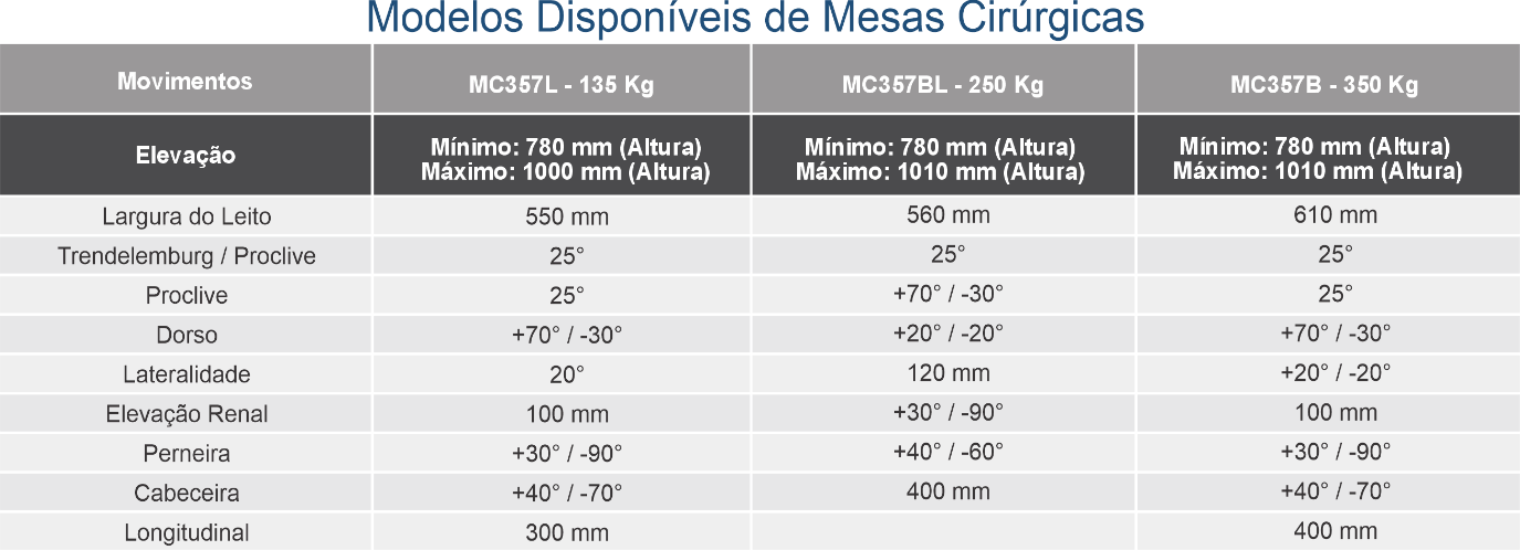 A mesa cirúrgica elétrica é equipada com comandos silenciosos acionados por um controle de mão com cabo, permitindo, por meio de articulações, a realização de diversos procedimentos cirúrgicos, incluindo:​